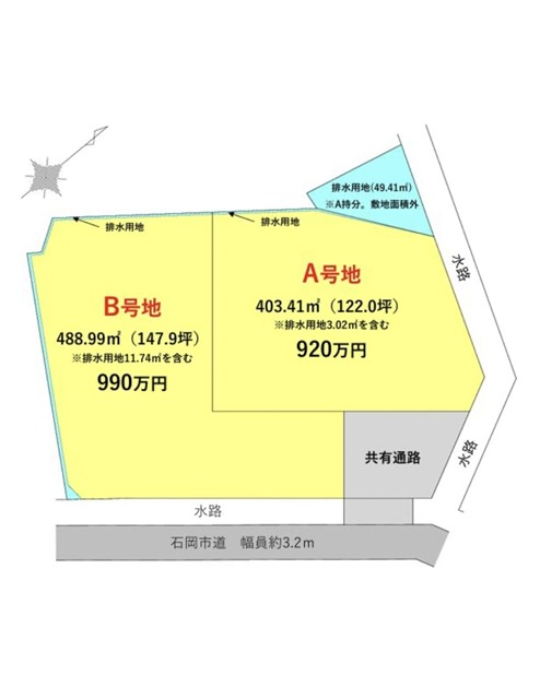 【A号地】 建築条件なし、公営水道、公共本下水、プロパンガス、電気 ※共有通路持分あり ※上・下水道宅内引込整備済 ※上・下水道整備負担金清算要:330,000円(上水道加入金及び下水道受益者負担金を含む) ※敷地面積に排水用地部分が含まれます ※A号地:排水用地部分(49.41㎡)を別途同時譲渡