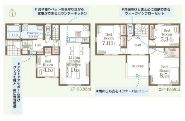 【1号棟】駐車場3台/公営水道/公共本下水/PG/電気/床下収納庫/洗面化粧台/玄関扉スマートキー/システムキッチン(人造大理石ワークトップ・スライドキャビネット・浄水器付)/1坪UB/WCウォシュレット/シャンプードレッサー/階段手すり/浴室乾燥機/全窓ペアガラス/照明器具(玄関外・ホール・1F廊下・キッチンダウンライト・ユニットバス内)/カラーTVインターホン/24時間換気/人感センサー/玄関収納/TV配線/基礎パッキン工法/サイディング仕様/地盤保証会社:ジャパンホームシールド