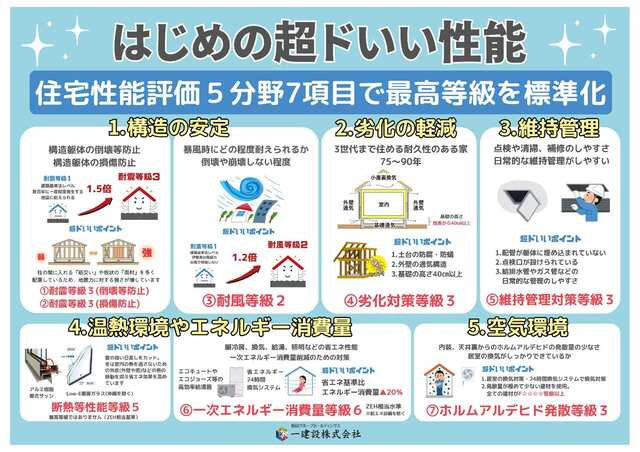 【1号棟】駐車場4台/公営水道/公共本下水/PG(業者指定)/電気/フラット35SタイプA/地盤保証20年間/設計・建設性能評価取得/長期優良住宅認定物件/玄関収納/床下収納/浄水器付き対面キッチン/シャンプードレッサー/洗浄便座/浴室乾燥機/全窓ペアガラス/基本照明(玄関外・ホール、キッチン、浴室)/人感センサー/TVモニタ付インターホン/24時間換気※フラット35適合証明費別途要