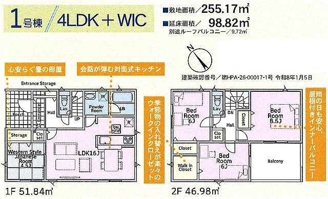 【1号棟】住宅性能保証付き/駐車場/公営水道/公共本下水/PG/電気/フラット35S(金利Aプラン)利用可/制震構造/人感センサー付玄関灯/ペアガラス/対面式システムキッチン(浄水器付)/モニタ付インターホン/浴室乾燥機/温水洗浄便座/1坪UB/シャンプードレッサー/24時間換気/手摺付階段/床下収納/カードキー/ディンプルキーWロック/外壁サイディング/EVコンセント/防犯カメラ ●TVアンテナ/雨戸シャッター/面格子/網戸/居室照明/カーテンレールは別途